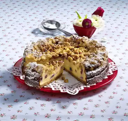 Add the quark mixture by the spoonful and spread the frozen berries between them, smoothing them down. Spread the remaining crumbles on top. Bake in the preheated oven (electric range: 200 °C/ convection oven: 175 °C/ gas: level 3) for 60-70 minutes on the bottom shelf. If the cake gets too dark, cover the surface with aluminium foil. Remove the cake from the oven, place on a grid and carefully remove from the edge. Let the cake cool down for about 5 hours (preferably overnight), then remove from the tin. Dust the edge with icing sugar and serve on a cake plate