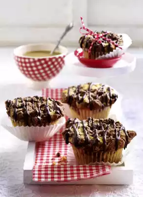 For the crumbles, dice 75 g butter. Put 150 g flour, 75 sugar, 1 pinch of salt, 1 packet of vanillin sugar, egg yolk, butter and cocoa in a bowl and work into crumbles with your hands. Chop the chocolate. Cream 150 g butter, 150 g sugar, 1 packet vanillin sugar and 1 pinch of salt. Stir in the eggs one by one. Mix 400 g flour and baking powder. Add alternately with the milk and stir in. Stir in chocolate. Peel bananas and cut into small cubes. Fold into the dough immediately. Line 12 hollows of a muffin tin with 1 paper baking tin each. Spread the dough evenly in them. Sprinkle with crumbles. Bake in the preheated oven (electric cooker: 175 °C/ convection oven: 150 °C/ gas: level 2) for approx. 25 minutes. Remove, place on a cake rack and let cool slightly. Lift out of the trays and allow to cool on the grid. Chop the chocolate coating and melt over a warm water bath. Pour into a freezer bag, cut off a small corner. Decorate the muffins with chocolate door strips, let them set