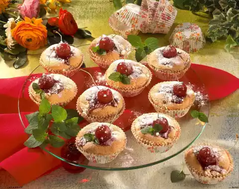 Leave to cool on a cake rack. Crumble the meringue. Heat the jelly while stirring and glaze the remaining cherries in it. Place on the muffins immediately. Sprinkle with meringue crumbs. Decorate with mint leaves as desired. Makes about 20 pieces
