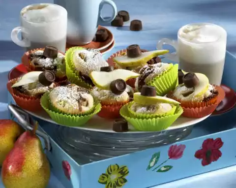 Place two paper sleeves in each trough of a muffin tin. Spread the dough evenly into the muffin moulds. Bake in the preheated oven (electric: 175 °C/ gas: level 2) for 20-25 minutes. Remove from the oven and carefully remove from the edge of the trough with a knife. Leave to cool on a rack. Then carefully lift out of the wells and dust with icing sugar. Serve decorated with pralines and pear wedges as desired