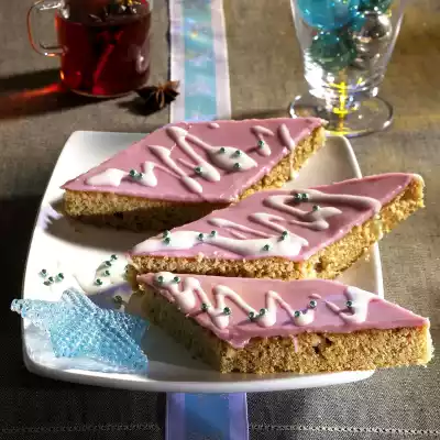 Take out and let cool down. Mix 400 g icing sugar and mulled wine with the whisk of the hand mixer until smooth. Spread the cake with it and let it dry. Cut into rhombs (approx. 5 cm wide). Stir 100 g icing sugar with lemon juice until smooth. Decorate the lozenges with it, sprinkle with sugar pearls and let dry.