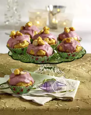 Caramelise 75 g sugar in a pan until golden. Remove from the heat, add the set aside nuts and turn in the caramel. Spread on a piece of aluminium foil lightly coated with oil. Mix icing sugar with mulled wine to a smooth, thick icing. Spread the icing on the muffins with a tablespoon of the icing. Sprinkle with purple sugar immediately and decorate with caramel nuts. Allow to dry