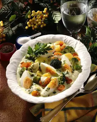 Peel and wash the potatoes and carrots. Cut potatoes into large pieces, carrots into slices. Clean and wash broccoli and cut into small florets. Cook potatoes and carrots in boiling salted water for 15 minutes. Add broccoli 5 minutes before the end of the cooking time. Cook the eggs in boiling water for 8 minutes, quench, peel and quarter them. Put 1/2 litre of cold water in a pot.