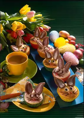 Wash the lemon thoroughly and finely grate the peel. Halve the lemon and squeeze one half. Cream fat, sugar and salt with the shcneebrooms of the hand mixer. Add the lemon zest and stir in the eggs one by one. Mix flour, cornstarch and baking powder and stir into the dough together with the lemon juice. Place about 16 paper baking cups, always two or three together, on a baking tray. Use a spoon to spread the dough into the baking tins. Bake in the preheated oven (electric cooker: 175 °C/ gas: level 2) for 20-25 minutes. Meanwhile sieve 50 g icing sugar and mix with 4 tablespoons of lemon juice. Prick the still warm tartlets several times with wooden skewers and soak them in the lemon icing. Let them cool down. For the ears, sieve 60 g icing sugar and 1 teaspoon of cocoa onto a work surface and knead with marzipan. Roll out marzipan about 4 mm thick and cut out 16 pairs of ears. For the icing, mix 150 g icing sugar, remaining zironen juice and about 1 tablespoon of hot water. Spread half of the tartlets with it and let them dry. Divide the remaining icing into three portions. Colour one part pink with red food colouring and another part brown with remaining cocoa. Leave the rest of the icing white and stir a little thicker with the remaining icing sugar. Shape the ears and coat them with pink and white icing. Leave to dry and place on the tartlets. Support with wooden skewers from behind. Then paint the white rabbit brown eyes and vice versa. Apply beard hair and nose with brown and red sugar writing. Finally dab the pupils of the eyes with brown sugar writing or white cast. Results in about 16 bunnies