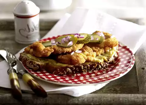 Drain on kitchen paper and let cool off. Peel onion and cut into rings or cubes. Cut cucumbers into slices. Spread slices of bread with mustard cream, cover with schnitzel and garnish with onion and gherkins