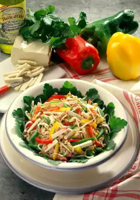 Wash the sprouts briefly under cold running water and let them drain on a sieve. Clean and wash the peppers and cut them into fine strips. Cut the tofu into strips as well.