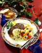 Cut ox breast into slices. Fry in the remaining hot clarified butter for 1 minute on each side. Season with salt and pepper. Beat the eggs and fry them in the cooking fat as fried eggs. Arrange slices of bread with brisket of beef, fried egg and onion sauce. Serve garnished with sweet and sour vegetables and chervil