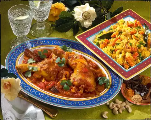 Season with salt. Bring to the boil, cover and let it swell for about 20 minutes at low heat. In the meantime mix saffron threads and 1 tablespoon of lukewarm water. Heat the oil in a large pan. Sauté the vegetables, remaining cinnamon and cardamom, bay leaf, turmeric, caraway and cashew nuts for 4-5 minutes. Add almonds and lemon juice to the chicken legs and braise for about 5 minutes. Season to taste with salt. Mix rice and saffron threads with water into the vegetables and fry for another 3 minutes. Season to taste with salt. Arrange chicken legs with sauce on a plate and vegetable rice in a bowl. Garnish chicken legs with coriander green