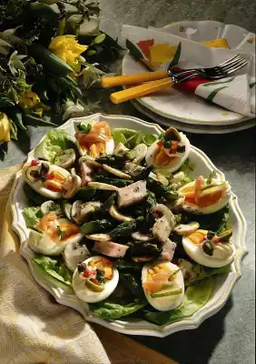 Whip the oil into it. Carefully mix asparagus, mushrooms and turkey breast cold cuts with the marinade and let it soak through a little. Clean, wash and drain the lettuce. Garnish egg halves with mayonnaise, capers, olives, salmon, diced tomatoes, slices of lime and parsley as desired. Line a plate with salad leaves. Arrange asparagus mushroom salad and egg halves on top