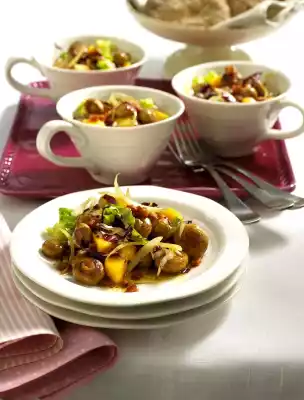 Add bacon and deglaze with vinegar and broth. Mix in olive oil, put everything in a bowl and fold in the onions. Let it cool down. Peel the mangos, cut the flesh off the stone and dice. Clean and wash the radicchio and romaine lettuce and drain well. Cut radicchio into very fine strips, romaine lettuce into slightly wider strips. Mix the mango and lettuce strips with the mushrooms, season again with salt and pepper and arrange in cups or on small plates