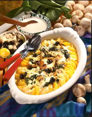 Drain the potatoes and let them cool down a little. Cut into thin slices. Place the potato slices in flakes on the edge of a flat casserole dish. Place the spinach and mushroom vegetables in the middle. Crumble the cheese coarsely and sprinkle over the vegetables with the olives. Mix cream and crème fraîche. Pour over the gratin. Bake in the preheated oven (electric cooker: 200 °C/ gas: level 3) for 20-25 minutes
