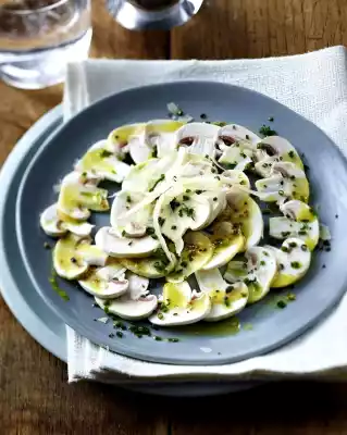 Clean and trim the mushrooms, cut them into fine slices and spread them on 4 plates like roof tiles. Sprinkle mushrooms with dressing, serve sprinkled with parmesan and chives