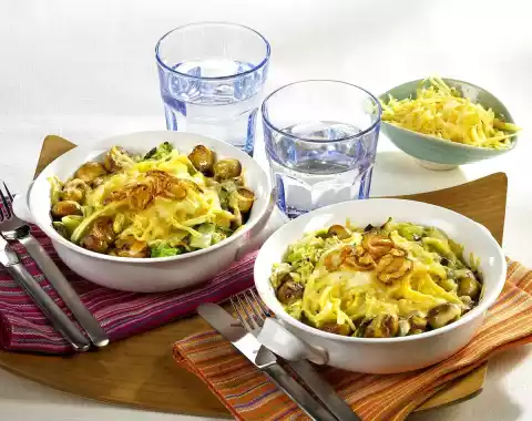 Put half of the spaetzle into 4 greased, ovenproof moulds and sprinkle with 100 g cheese. On top of each of them add steamed pointed cabbage and mushrooms with cream sauce. Spread the rest of the spaetzle on top and sprinkle with 100 g cheese. Gratinate in the preheated oven (electric cooker: 225 °C/ convection oven: 200 °C/ gas: level 4) for about 10 minutes. In the meantime, peel onions and cut into fine rings. Heat 15 g fat in a frying pan and fry the onions until golden brown. Put the onions on the finished spaetzle and serve immediately