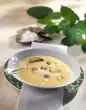 Add processed cheese and melt in it. Season with salt and pepper. Wash parsley, dab dry, pluck leaves from the stems and add to the soup. Cut off the edges of the bread. Cut bread into triangles. Heat the remaining butter in a pan and fry the bread in it until golden brown. Arrange the soup in small bowls, garnish with parsley if necessary and serve together with the roasted chunks
