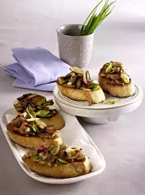 Cut bread into 16 thick slices. Heat 2 tablespoons of oil in portions in a frying pan. Roast the bread in portions on both sides for about 3 minutes until golden brown. Take out and cover each with 1-2 tbsp. mushroom mixture