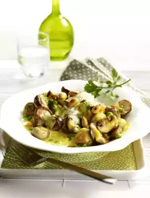 Prepare rice in boiling salted water according to package instructions. Heat oil in a pan. Sauté the mushrooms in it. Add onion, carrot and peas, fry for about 5 minutes, season with salt, pepper and thyme. Sprinkle with curry and flour. Deglaze with milk and cream, bring to the boil and simmer for 2-3 minutes. In the meantime roast almonds in a pan without fat, take them out. Wash parsley, shake dry and cut into strips except for a little bit for garnishing. Add to the mushroom pan. Drain the rice.