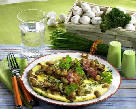 Finally add herbs and season with salt and pepper. Heat 5 g fat in each of two small coated pans (approx. 20 cm Ø) and put approx. 1/8 of the mushrooms in each pan. Pour 1/4 of the egg dough over each of them and let them simmer covered at low to medium heat.