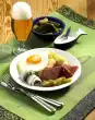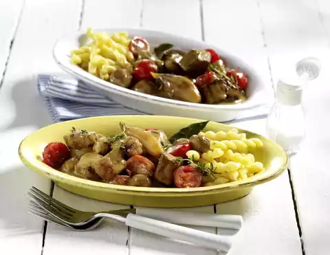 Wash and halve the tomatoes and add them to the goulash 10 minutes before the end of the cooking time. Prepare pasta in boiling salted water according to package instructions. Mix cream and flour. Stir into the goulash, bring to the boil again.