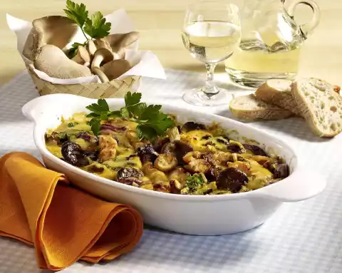 Pour the sauce over the mushrooms evenly. Sprinkle the cheese on top and bake in the preheated oven (electric cooker: 175 °C/ convection oven: 150 °C/ gas: level 2) for approx. 35 minutes until golden brown. Garnish with parsley.