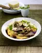 Wash the meat, dab dry and cut into thumb-thick strips. Season with salt and pepper. Heat 1 tablespoon of oil in a frying pan and fry the meat for about 5 minutes, turning it over. Add mushrooms, meat and onions and an ovenproof dish.