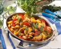 Then drain. Season the lamb pan with salt, dried chilli, herbs and spring onions. Puree the peppers in the liquid. Add to the lamb pan. Fill up with 200 ml water, bring to the boil briefly.