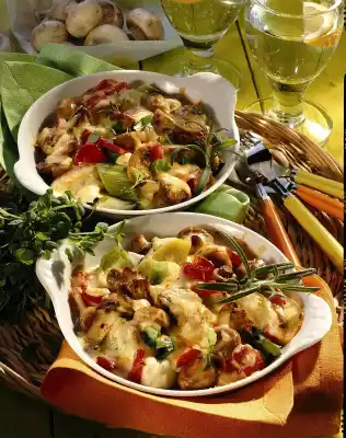 Measure out a good 1/8 litre and pour into the pan with the cream to go with the mushrooms. Stir in Fix for gratin and bring to the boil briefly. Fold in leek and paprika and distribute in two greased gratin dishes. Sprinkle with cheese and bake in the preheated oven (electric: 200 °C/ gas: level 3) for about 15 minutes. Serve garnished with fresh oregano and rosemary