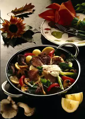 Clean and wash spring onions and cut them into bite-sized pieces. Leave to stand in boiling water for two minutes. Clean, wash and cut the tomatoes into eighths, remove the seeds. Clean, wash and drain the mushrooms well and cut in half.