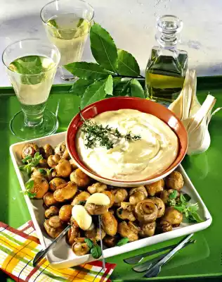 Whip the oil gradually, then add a thin stream of oil. Stir in garlic and soured milk. Season the aioli with salt and pepper and chill. Clean and possibly wash the mushrooms. Heat the olive oil in a large pan and fry the mushrooms in it in portions, turning vigorously.