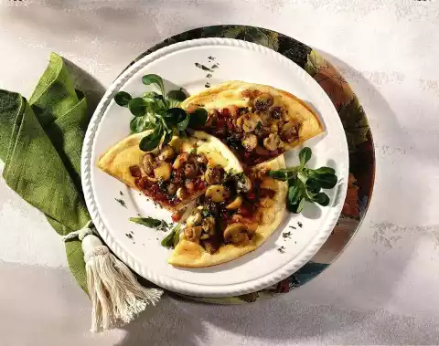 Fry the mushrooms, onion, garlic and bacon for about 3 minutes. Season with salt and pepper. Sprinkle with parsley. Drain the liquid. Separate the eggs for the pancake batter. Beat the egg white until very stiff.