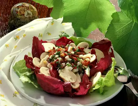 Boil eggs for 10 minutes and quench. Wash the radicchio and oak leaf lettuce and chop them up roughly. Wash, clean and slice the mushrooms. For the sauce, peel eggs and dice finely.