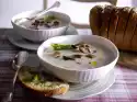 Wrap in a tea towel and tie the ends together. Put the dumpling roll in a large pot with lightly salted boiling water. Cover and let it simmer for about 30 minutes at low heat. Remove the roll, cool it down a little and let it drain. Wrap the roll out of the cloth and cut it into thick slices. Heat some clarified butter in a casserole and fry the mushrooms and shallots in 3 portions. Finally put all the mushrooms and shallots in the pan. Stir in marjoram, chives and tomato paste, season with salt and pepper. Deglaze with the porcini mushrooms in the soaking water. Add white wine and cream and braise covered for 10-15 minutes. Heat the remaining fat in a pan and fry the dumpling slices in it. Stir the sauce thickener into the ragout and bring to the boil again briefly. Season to taste with salt, pepper and some instant broth to taste. Arrange the ragout with the dumpling slices on plates. Serve garnished with chives and marjoram