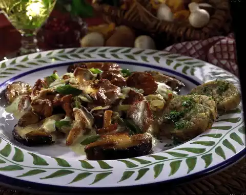 Cut the porcini into slices. Fry briefly over high heat in 1 tbsp. hot clarified butter until golden brown. Season with salt. Take out dumplings, let them rest for a while and cut them into slices. Serve with whole mushrooms