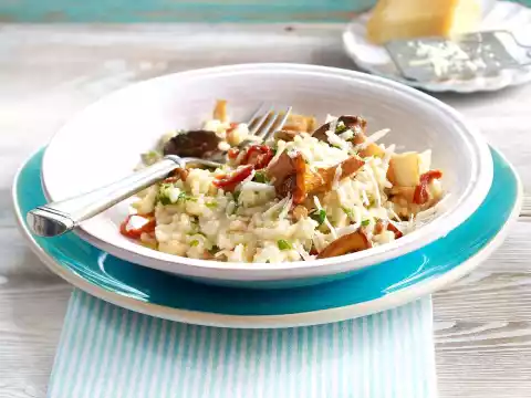 Heat 1 tablespoon of oil in a frying pan. Sauté the mushrooms in it. Add the tomatoes and fry briefly. Season with salt and pepper. Stir 2/3 parmesan and parsley into the risotto. Fold in the mushroom and tomato mixture.