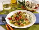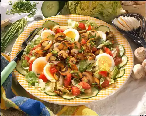 Boil the egg hard. Quench, peel. Chop mushrooms, cucumber, tomato and salad. Fry mushrooms in oil in a coated pan. Stir in vinegar, broth and chives, season. Mix with salad ingredients.
