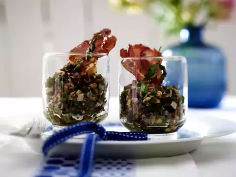 Finely chop the rest of the parsley. Cut chives into fine rolls. Mix the herbs into the cooled mushroom tartar. Season to taste with lemon juice and possibly salt and pepper again. Divide into four glasses.