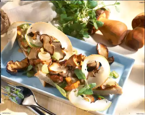 Stir starch into 1 tablespoon of water until smooth and bind the mushroom vegetables with it. Wash the marjoram, dab dry and pluck off the leaves, except for something to garnish. Stir the marjoram into the vegetables. Roast toast until golden brown.