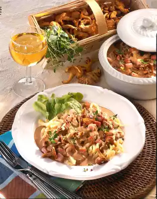Mix flour, eggs, mineral water, 1 teaspoon of salt and nutmeg with the dough hook hand mixer to a thick, smooth dough and knead until bubbles appear. Let the dough rest for 1-2 hours. In the meantime clean the chanterelles, wash them thoroughly and drain them well. Cut the smoked pork loin into small cubes. Peel and finely dice the onion. Wash the thyme, dab dry and pluck the leaves from the stems.