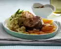 Chop the thyme, except for a little bit for sprinkling. Heat the fat in a pan and fry the chanterelles briefly. Add diced onion and smoked pork. Fry for 2-3 minutes and season with a little salt, pepper and thyme. Add broth, cream and sour cream, bring to the boil and cook for about 3 minutes. Add sauce thickener while stirring and bring to the boil again briefly. Season with salt and pepper and keep warm. For the spaetzle, boil up plenty of salted water. Little by little put a part of the spaetzle dough on a moistened "sparrow board" and scrape fine strips into the boiling water with a long knife. Cook the spaetzle until they rise and remove with a skimmer. Quench briefly on a sieve under cold water, drain and keep warm. Process the rest of the dough in the same way.