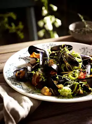 Remove the mussels, bacon and leek and keep warm. Sort out mussels that have not been opened. Boil down the cooking liquid briefly and pour it over the mussels. Season with pepper and sprinkle with thyme
