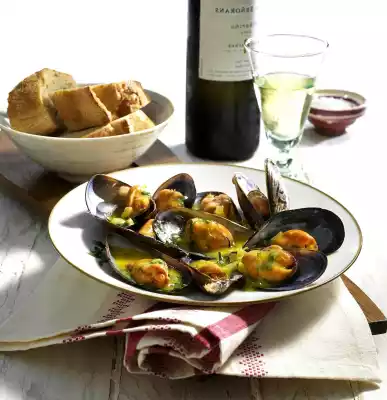 Drain mussels, discard closed mussels. Remove meat from the shells, put shells aside if necessary. Let the mussels steep in the sauce for about 1 minute, stirring carefully. Arrange mussels and sauce in their shells. Serve with white bread and salad