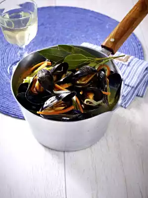 Add white wine and bring to the boil. Add mussels and cook covered over low heat for 8-10 minutes. Arrange mussels with stock (throw away the unopened mussels). Delicious with baguette bread