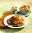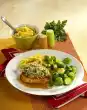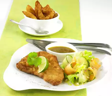 Mix vinaigrette and salad. Arrange salad, schnitzel and mustard dip on plates and garnish with coriander and lime wedge. Potato wedges taste good with it.