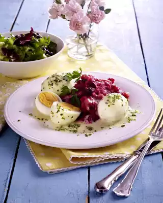Peel and chop the potatoes and cook them in salted water for about 20 minutes until soft. Chop the beetroot finely. Boil eggs in boiling salted water for about 9 minutes