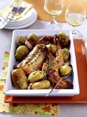 Wash the rosemary, shake dry and remove the needles. Wash the potatoes thoroughly. Spread the potatoes and rosemary around the rabbit parts about 35 minutes before the end of the cooking time. Drizzle with olive oil, season with salt and pepper.