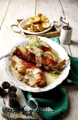 Add the shallots to the frying fat, fry vigorously while turning, add the bay leaf and fry briefly. Mix in mustard, deglaze with stock and cream, add legs and braise covered for about 1 1/4 hours.