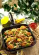In the meantime, wash the potatoes and boil them in water for 15-20 minutes. Afterwards drain cold, rinse and peel. Peel, wash and cut carrots into pieces. Clean and wash spring onions, also cut into pieces.