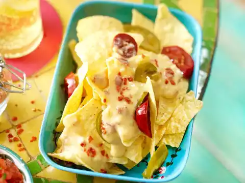 Arrange nachos, jalapeños and cheese sauce in bowls, sprinkle with chilli flakes. Add the tomato salsa