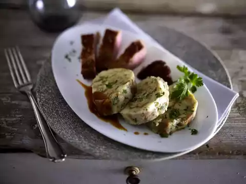 Lift out dumpling roll, unwrap. Cut into slices with a knife or a piece of string. To do this, place the thread around the roll and pull it crosswise. Goes well with poultry, game dishes or roast with sauce.
