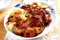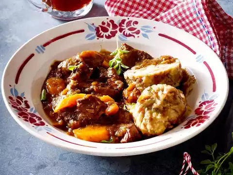 Peel, wash and slice the carrots diagonally. Ca. 1⁄3 set aside. Peel 3 onions, quarter them and cut into strips. Finely crush pimento in a mortar. Dab meat dry and cut into large cubes. Heat the oil in a roasting pan and fry the meat in it in portions all around. Fry carrots, onion strips and allspice briefly. Season with salt, pepper and 1 pinch of sugar. Add all the meat again. Add beer and 1⁄2 l water. Bring to the boil, cover and simmer for about 2 hours.