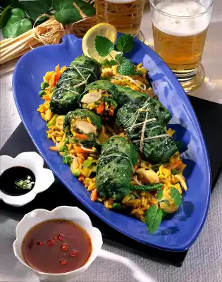 Cut out the stalk and blanch the leaves in boiling water for about 1/2 minute. Rinse under cold water. Carefully spread leaves on the work surface and place 1 heaped tablespoon of Nasi Goreng in the middle of each leaf.